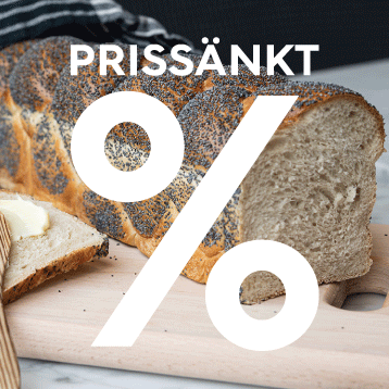 Sedan 1 Mars har momsen på våra bakverk sänkts från 12% till 6%. Detta gör att du kan köpa alla våra bröd, frallor, bullar, tårtor och praliner för ett lägre pris än innan. Priserna gäller när du köper med dig hem, priser i serveringen är fortfarande 12%.